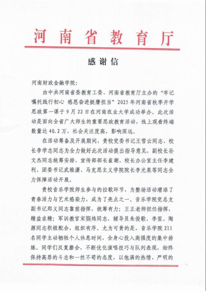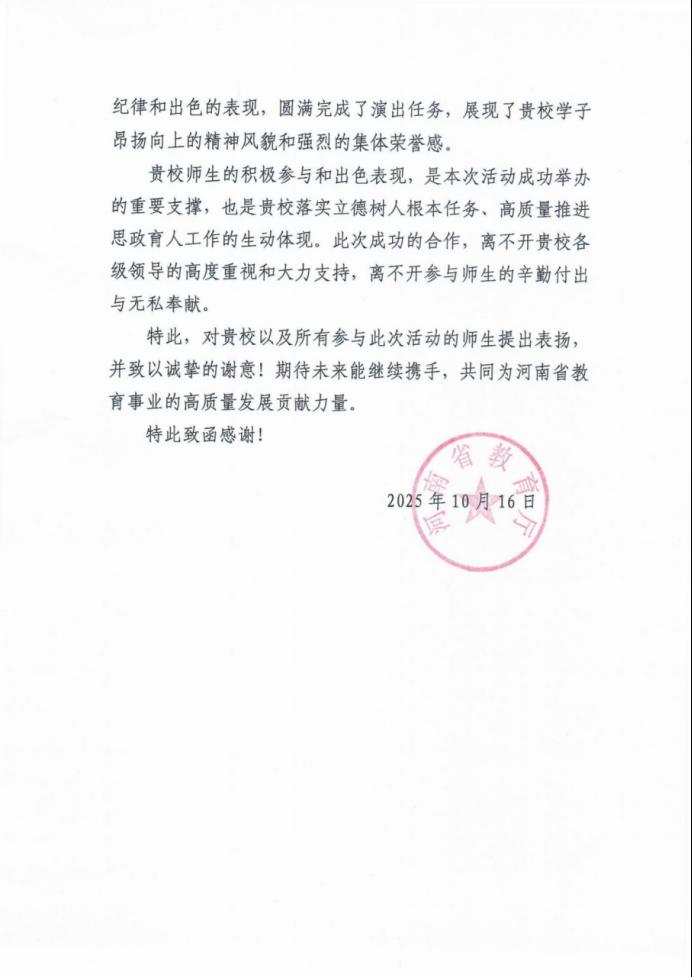 近日,河南省教育厅向我校发来感谢信,对我校师生在2025年河南省秋季开学思政第一课活动中的出色表现予以高度肯定,对学校表示诚挚感谢。